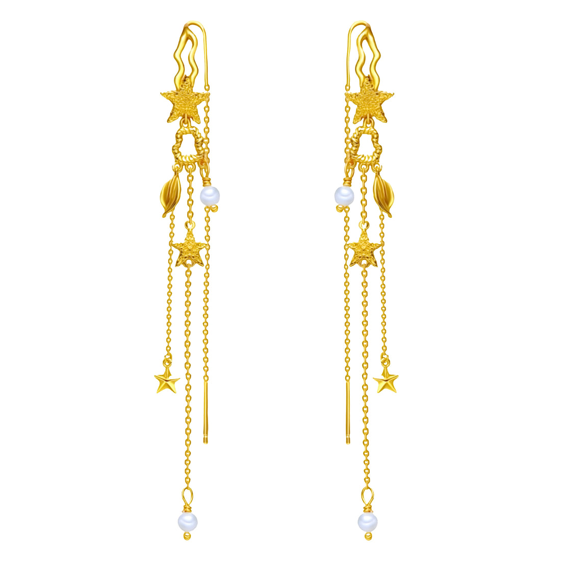Søstjerner Øreringe fra Pallantis: Forgyldte sølvøreringe med ujævne loops, pyntet med hængende søstjerne og to små ferskvandsperler, vist mod hvid baggrund.